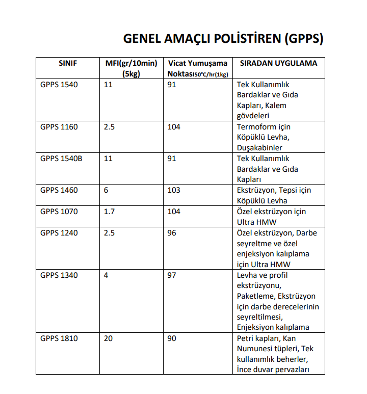 İşleme Durumu: GPPS 1540 kalıplanmış uygun makine ve eşyasının türüne bağlı olarak farklı koşullar altında işlenebilir. GPPS işlenmesi sırasında stiren 1540’den az miktarda atmosfere salınabilir.